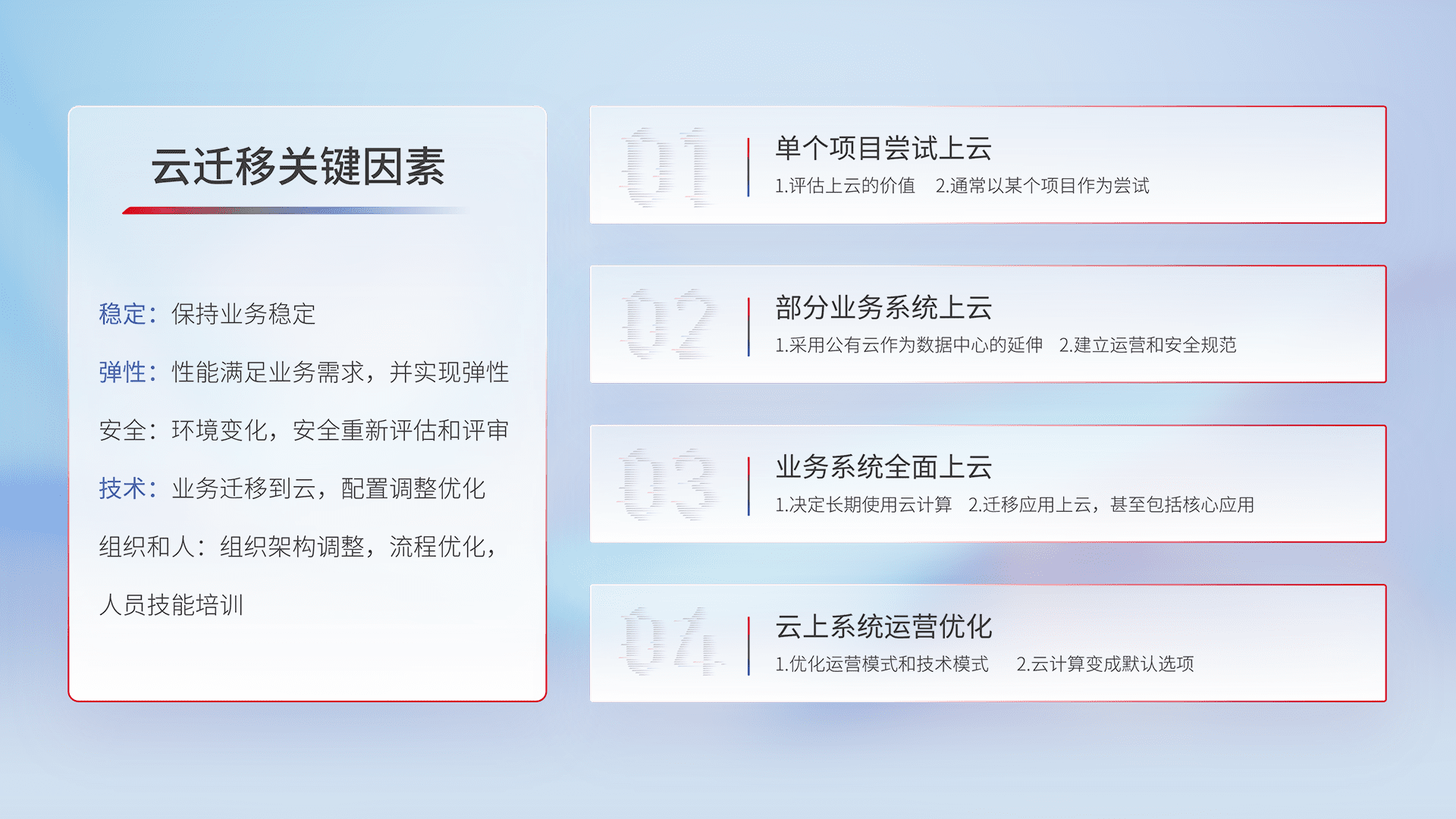 结合实际业务,,,从规划设计、、云平台选型、、、云原生改造、、、、数据迁移、、、集成交付,,,迁移全过程为客户识别最佳上云路径,,,做好风险识别管理,,,,设计网络架构、、、、身份权限、、安全审计合规、、操作审计、、、、日志审计、、、监控告警策略、、、多站点容灾设计等,,,对云上基础设施进行整体规划,,,,提升IT治理水平,,以满足弹性、、、、高可用、、、高性能的需求。。。。