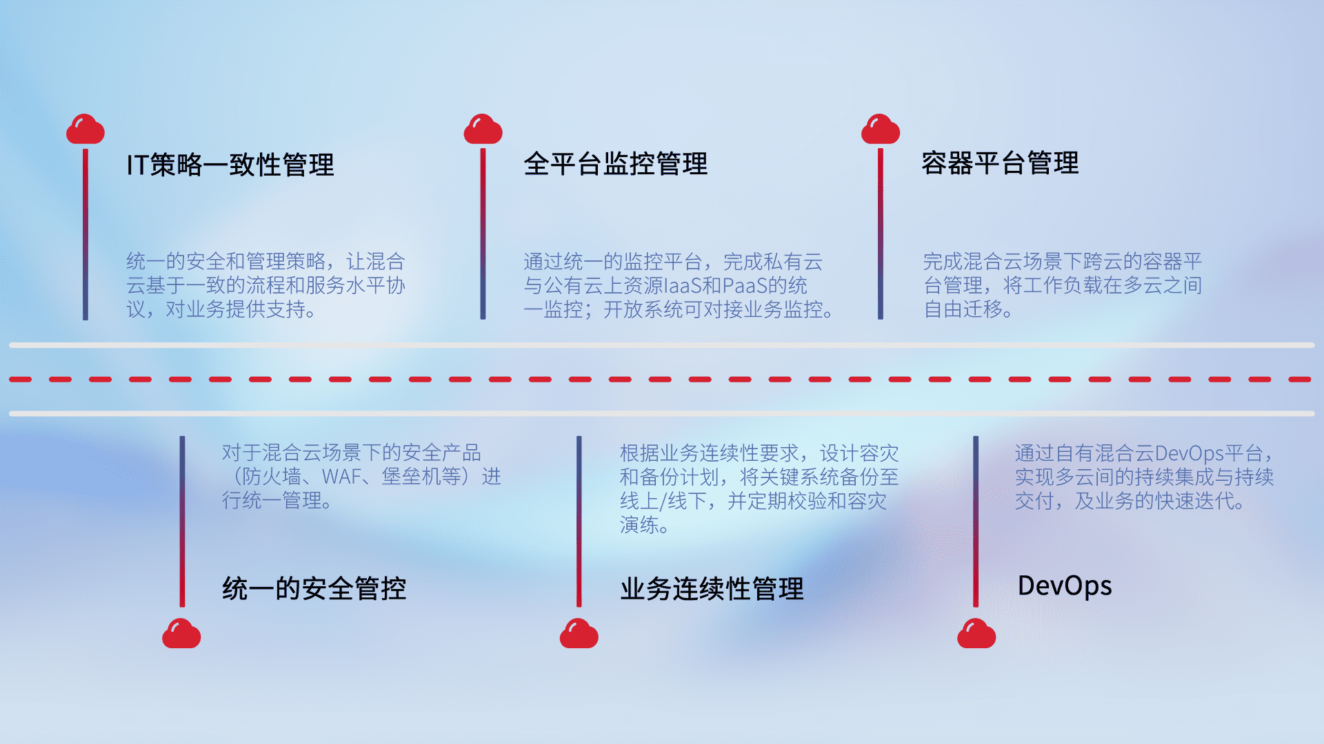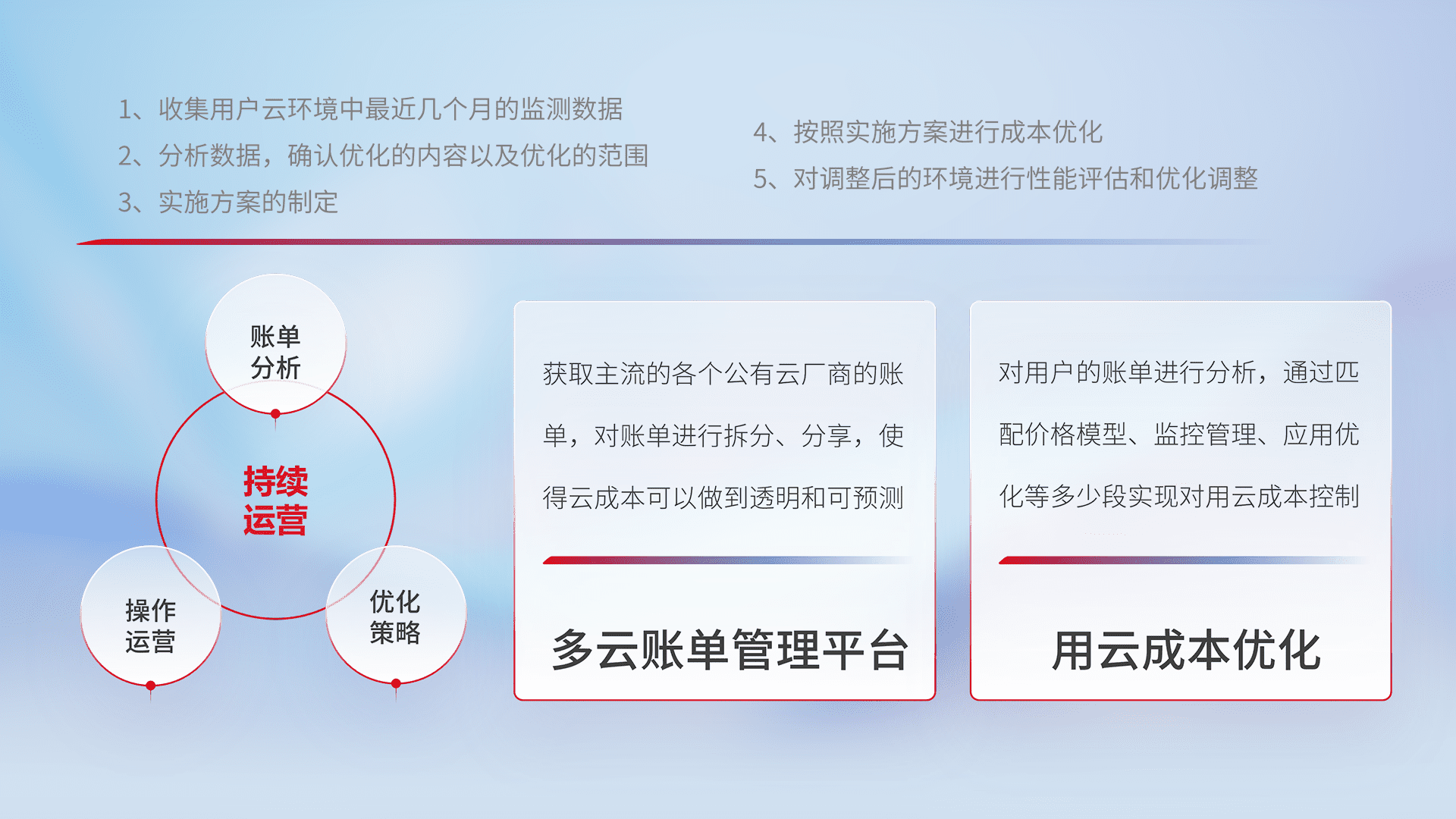 通过多云纳管,,以统一的资源数据模型把客户的云资源进行抽象和封装,,,进而实现对多云资源的统一操作,,,保障云资源管理的可靠性、、、稳定性与可用性。。。量身定制化运维内容,,配置、、、开发运维、、、、补丁管理、、、备份、、、监控、、、、认证和访问管理、、审计和日常巡检等,,,,保障在用云过程中的可靠度,,,,稳定度以及高可用率。。。