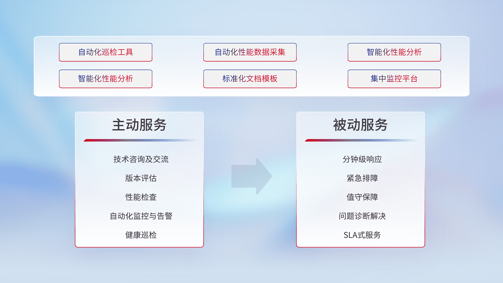 智能化工具和标准化文档,,,保障服务质量,,,,提供主动服务(包含技术咨询、、、版本评估、、、性能检查、、、自动化监控与告警、、、健康巡检)和被动服务包含(分钟级响应、、紧急排障、、、、值守保障、、问题诊断解决、、、SLA服务)。。